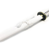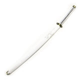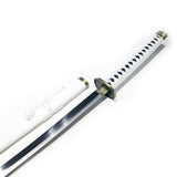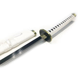 The Wado Ichimonji is a sword of great personal importance to Roronoa Zoro, and it was once Kuina and her family's sword. It is also one of the 21 O Wazamono grade swords. Upon Kuina's death, Zoro asked for it from her father. The sword features a high carbon dual tone blade. The scabbard is all shiny white with a nylon bow wrap. The handle is also white nylon wrapped over black faux ray skin. The guard is a solid piece of metal with a black middle surrounded by a gold border.